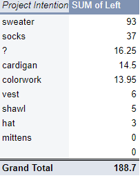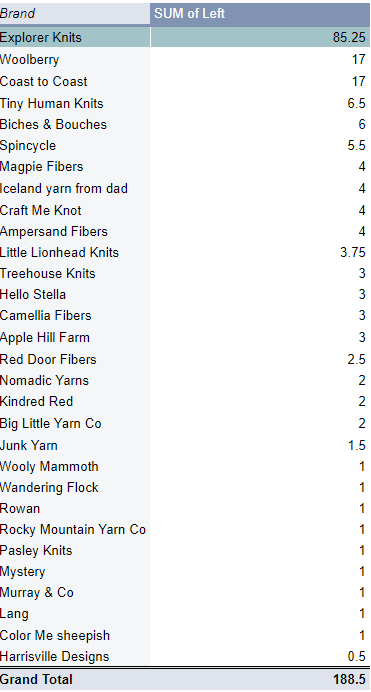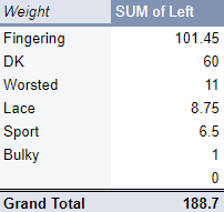 The tables give a lot of opportunity to draw inferences. Unlike when working with aggregated data at work, I can make more conclusions since I am the subject. I can see that I tend to be consistent with the dyers and yarn brands that I like and will return to them over and over again. I’m in general a consistent buyer of yarn. We can see that I’ve favored certain weights and certain project types. In a way this is a good thing because there is a lot of opportunity to use the yarn that is already there without having to add more.