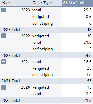 So as we can see there was a clear flip of tonal yarns vs. variegated yarns this year. While variegated had been the highest category we can see that tonal slowly crept up/kept pace. Until 2023. The year I started to be more intentional about purchasing.