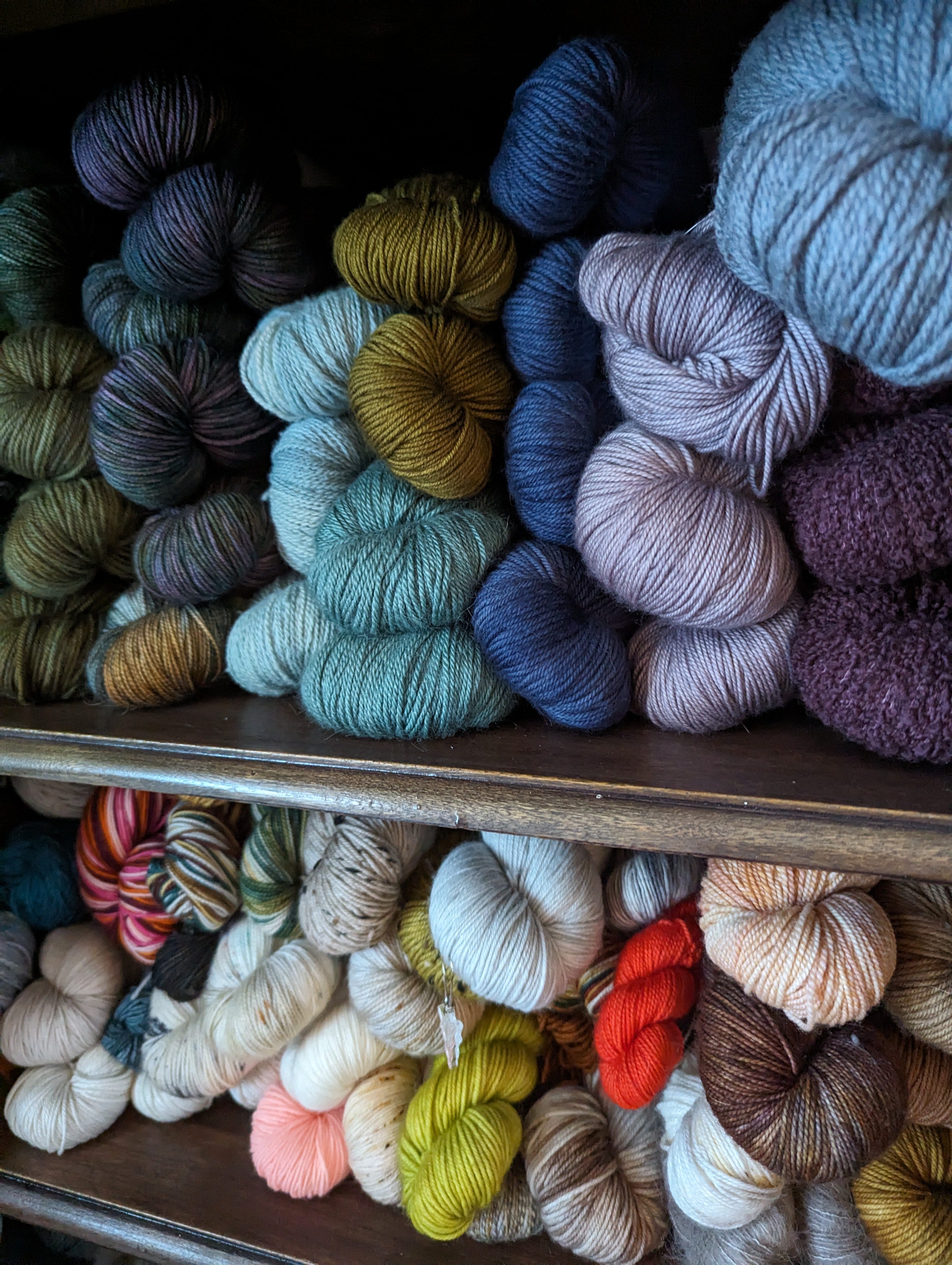 With color type, the self-striping category is a bit deceiving because most of those are 50g skeins so it is really more than 9.5 but we have to be consistent or it will all be chaos. I think it is interesting that the total is almost exactly half tonal and half variegated. Over time, I’ve shifted more towards tonal and away from the multi-colored skeins. The split likely reflects the change in buying habits and what was already built up over time.